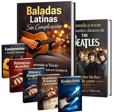 Este ebook conecta todo lo aprendido para que puedas tocar canciones completas desde el inicio. Aprenderás a seguir la estructura de una canción, coordinar acordes con ritmo y mantener el flujo sin detenerte. Es donde empiezas a ver resultados reales y a disfrutar tocar de verdad.